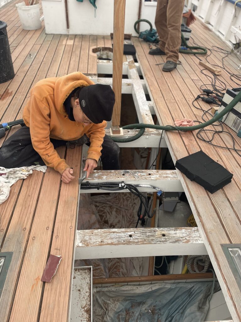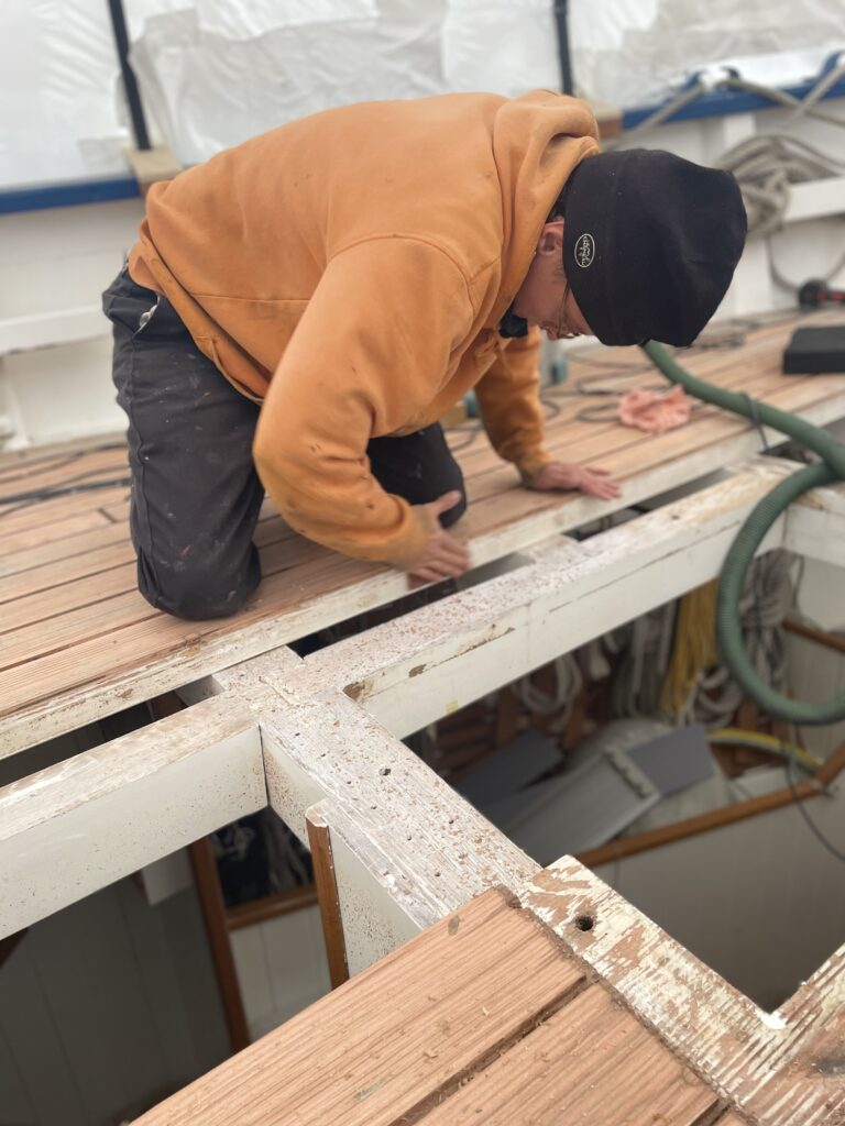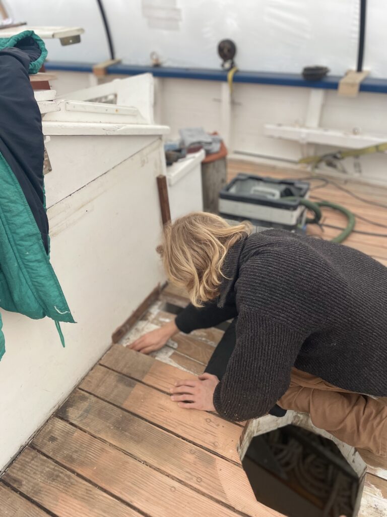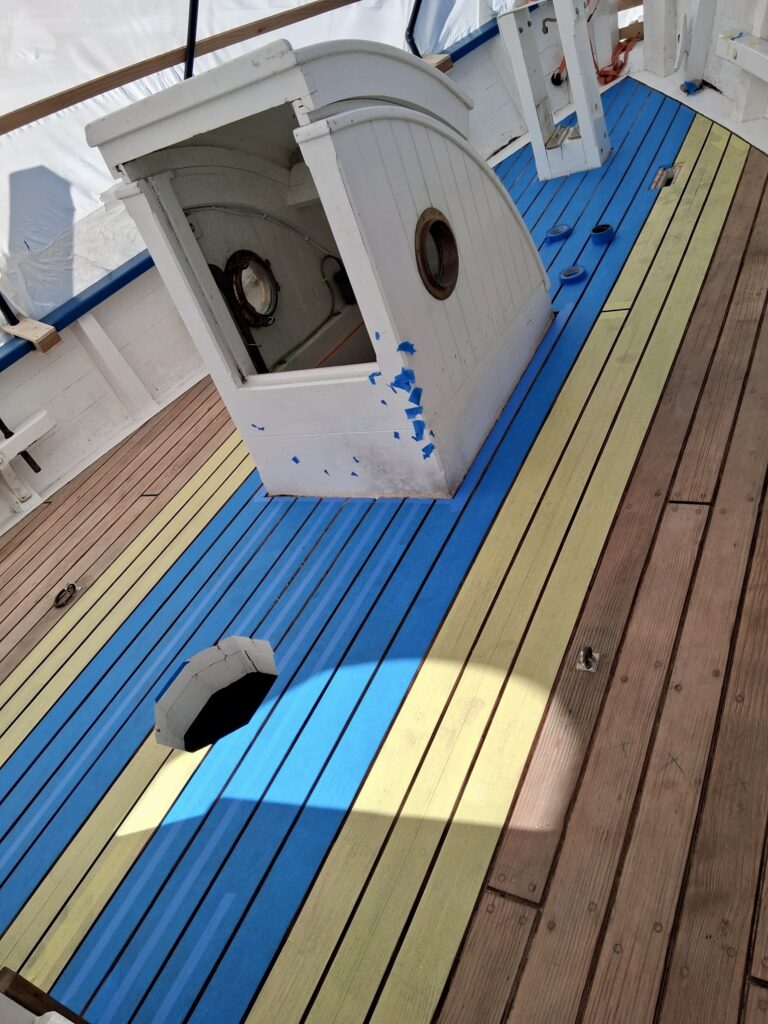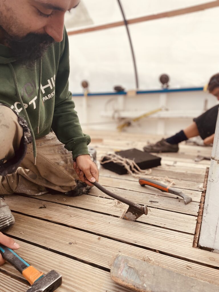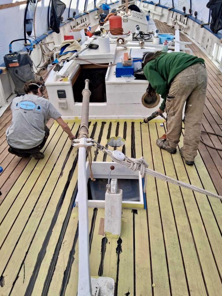 Enfin, le calfatage du pont : notre équipe ayant déposé les anciens joints de pont ainsi que l’ancien calfatage en coton, ils ont ensuite nettoyé les fonds de joints et repris la propreté des bords de lame à la scie circulaire. Ponçage minutieux puis mise en place d’un bitord pour ensuite poser une tresse de calfatage coton pour chaque joint de pont à l’aide de fer à calfat.