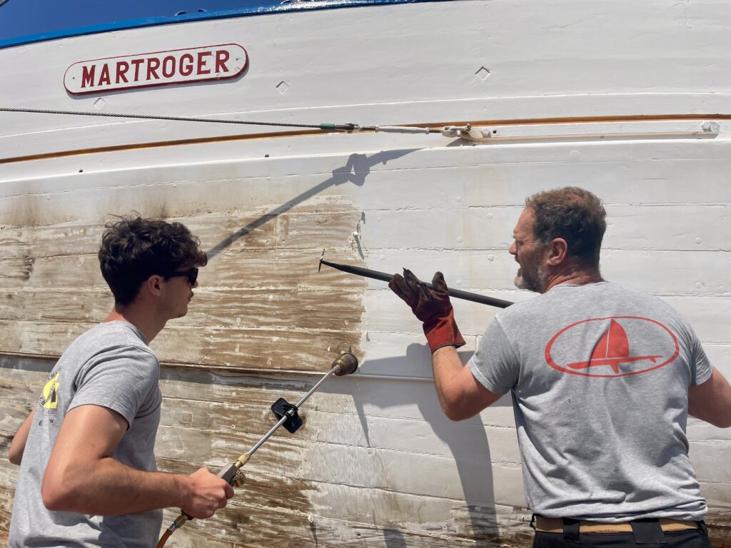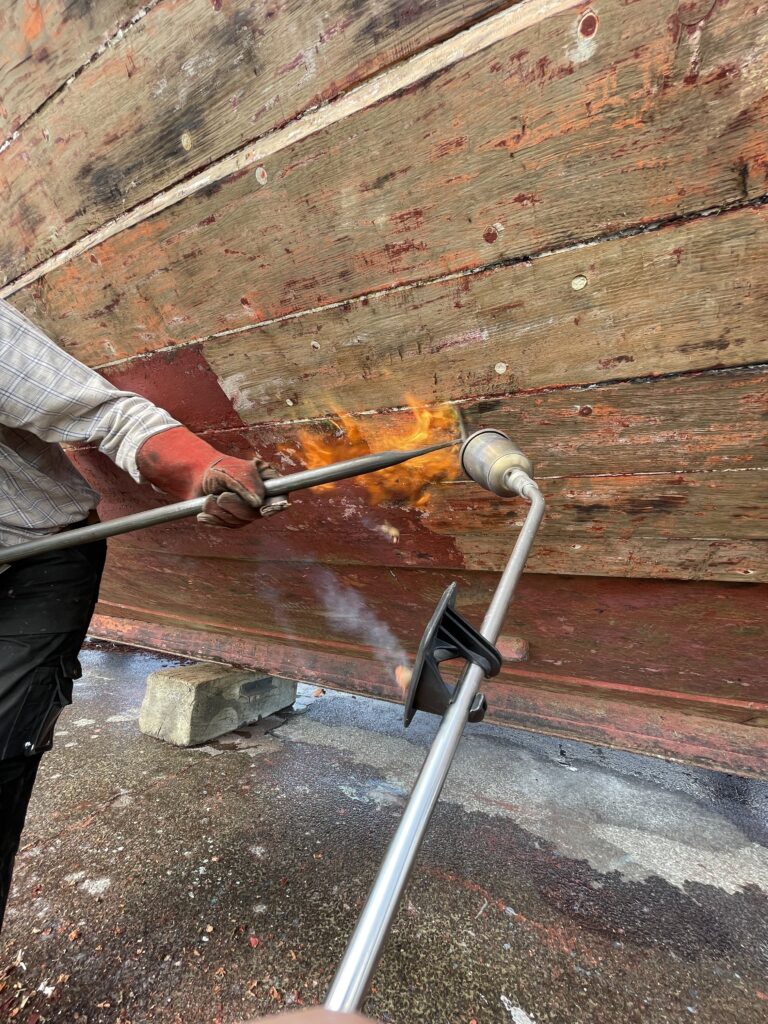 Notre équipe a commencé par un nettoyage complet et surtout un décapage en profondeur de la coque avec une technique traditionnelle qui permet de retirer efficacement les anciennes couches d’antifouling tout en respectant le bois : le grattage sous flamme dans le sens du bois !