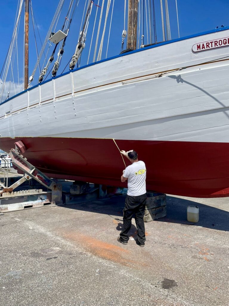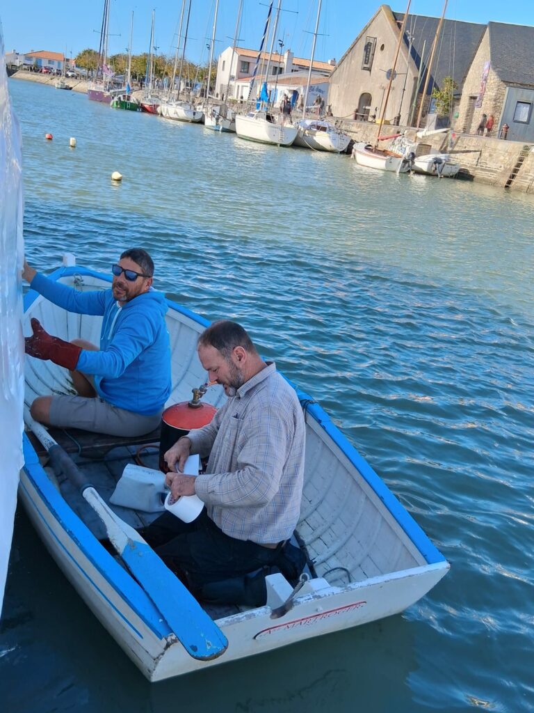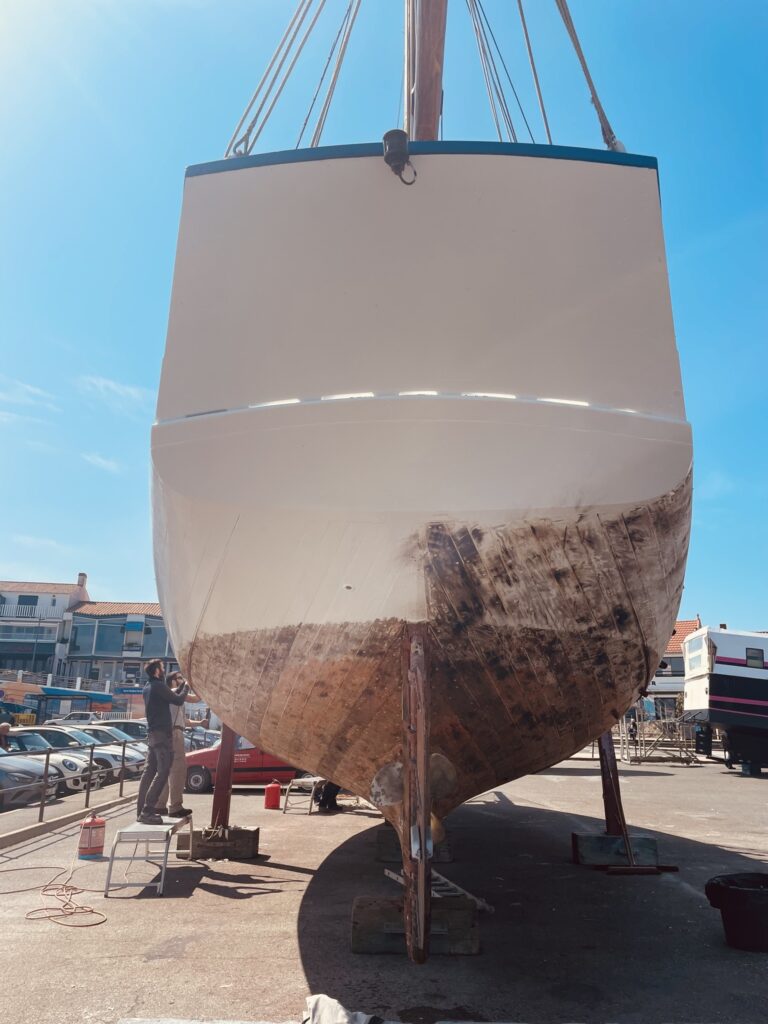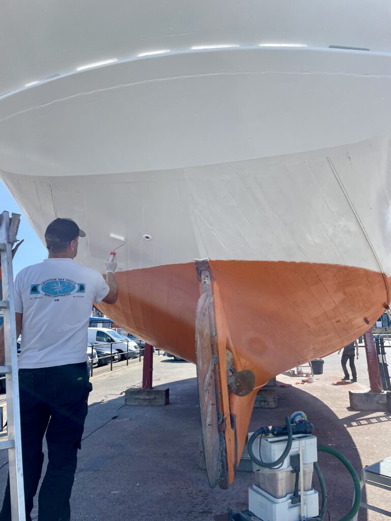 Les surfaces ont ensuite été soigneusement préparées par du ponçage, avant l’application d’un primaire puis d’une laque sur les oeuvres mortes. Côtés oeuvres vives : quelques zones ont nécessité une légère reprise de calfatage afin de garantir la bonne étanchéité de la coque. L’ensemble des oeuvres vives a été protégé par une sous-couche puis par l’antifouling.