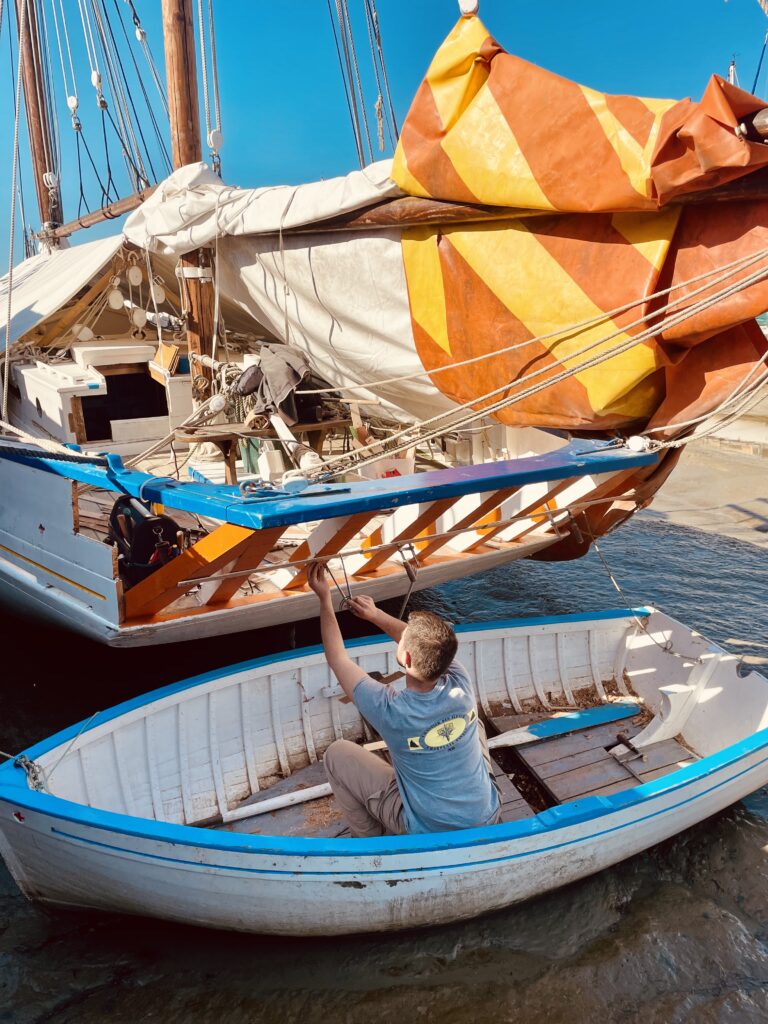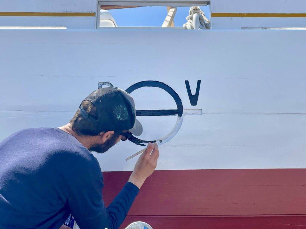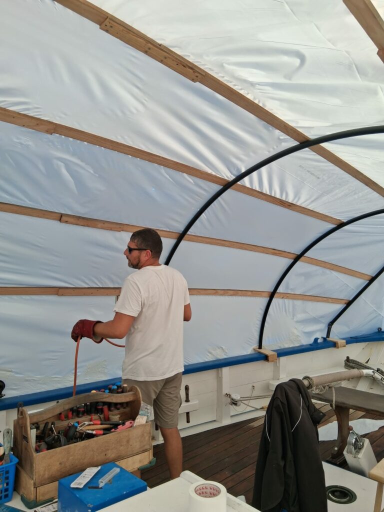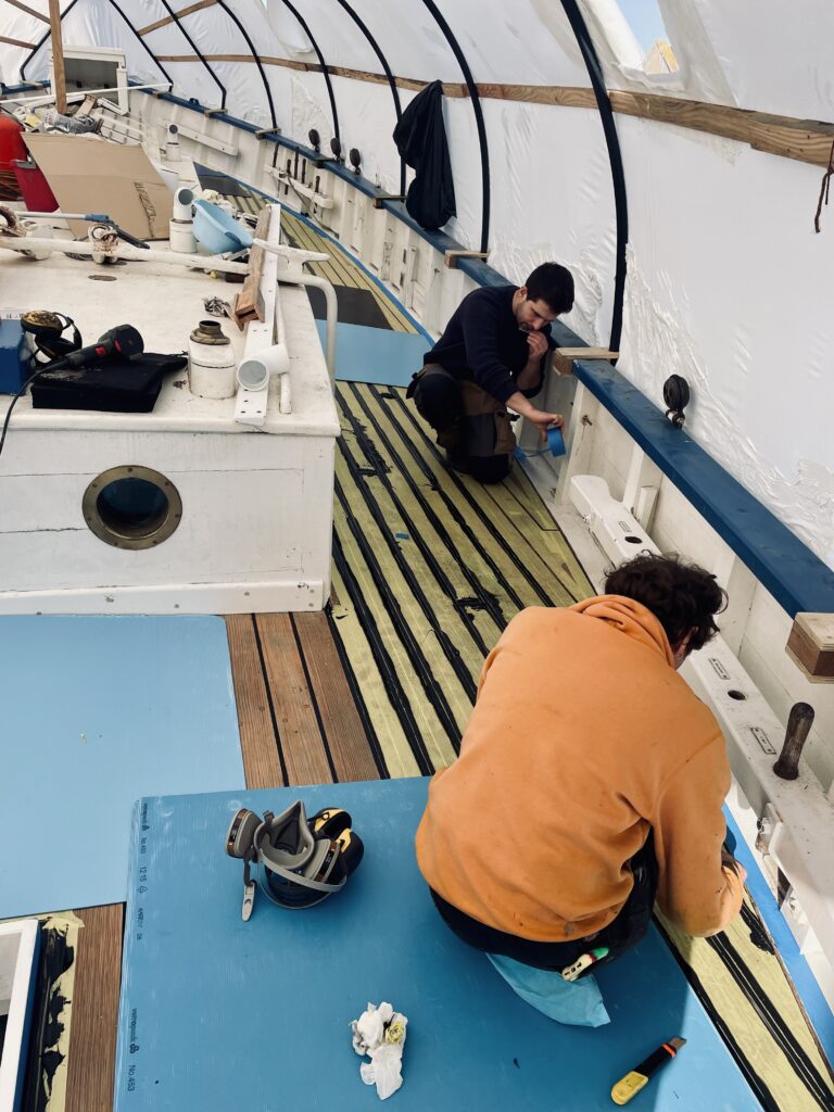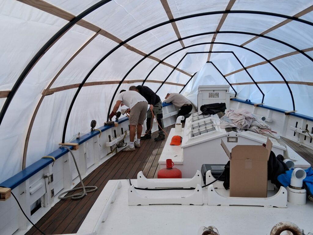 Les surfaces ont ensuite été soigneusement préparées par du ponçage, avant l’application d’un primaire puis d’une laque sur les oeuvres mortes. Côtés oeuvres vives : quelques zones ont nécessité une légère reprise de calfatage afin de garantir la bonne étanchéité de la coque. L’ensemble des oeuvres vives a été protégé par une sous-couche puis par l’antifouling.