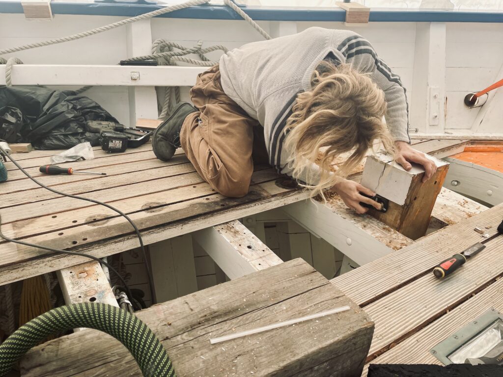Les nouveaux bordés ont été réalisés en sapin du Nord, puis soigneusement mis en place avec de l’époxy, ponçage, collage et finition complète. Les visseries et consommables ont également été remplacés pour garantir une parfaite tenue dans le temps.